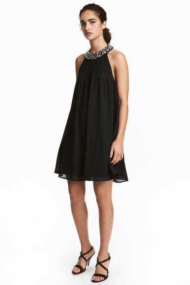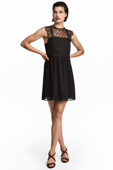 Abito corto smanicato in chiffon con il top ricamato in pizzo, dal prezzo di 29,99 euro.