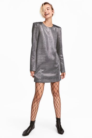 Abito corto a maniche lunghe con le spalline imbottite in tessuto argentato glitterato, dal prezzo di 19,99 euro.