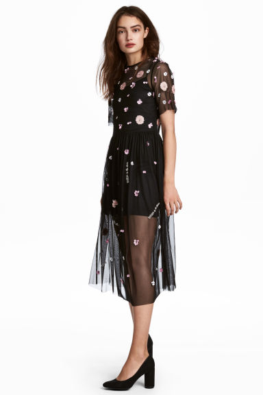 Delizioso abito in tulle a maniche corte con ricami floreali e scritte in paillettes, dal costo di 49,99 euro.