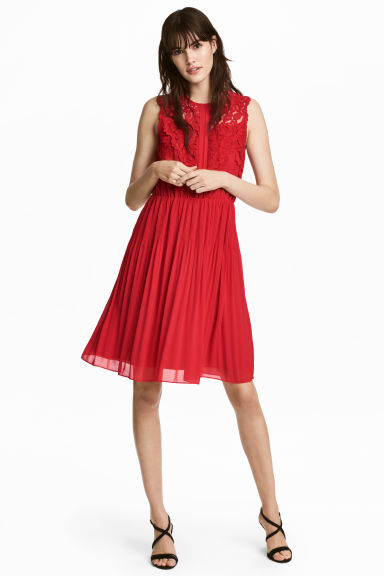 Abito rosso smanicato in chiffon, con la gonna svasata e corpetto decorato da pizzo, perfetto sia per Natale 2017 che per Capodanno 2018!