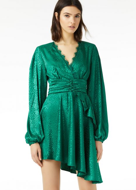 Abito corto a maniche lunghe in raso motivo animalier con scollo ad incrocio e gonna asimmetrica, dal prezzo di 179 euro.