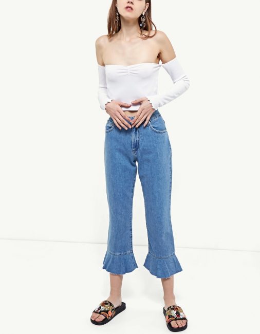 Maglietta attillata con spalle scoperte e maniche lunghe (alla Chiara Ferragni) dal prezzo di 12,95 euro abbinata a jeans con volant sul bordo inferiore da 29,95 euro.