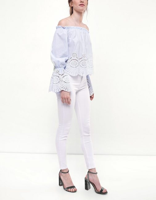 Top con spalle scoperte e maniche ricamate a campana da 25,95 euro abbinato a pantaloni elasticizzati push up da 19,95 euro.