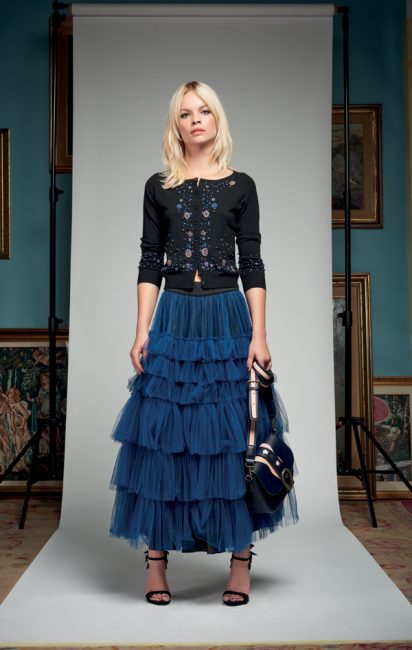 Le meravigliose ballerine spagnole di Flamenco hanno ispirato la realizzazione di questa gonna lunga in pizzo nero decorata da piccole rouches, con abbottonatura centrale e bordo a contrasto di colore. Il suo prezzo di vendita è di 191 euro.