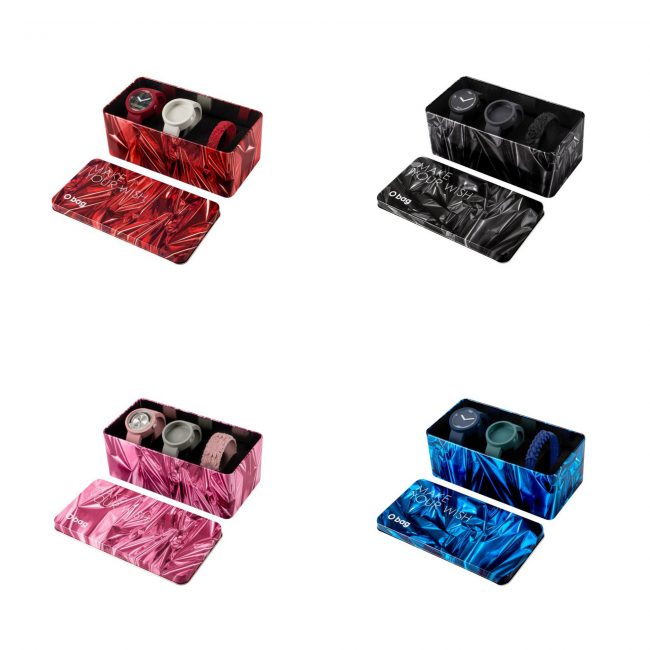 L’O Clock Xmas Pack si compone da: 1 confezione in latta, 1 orologio completo di meccanismo O Clock, 1 cinturino di ricambio e di 1 braccialetto in gomma O bag.