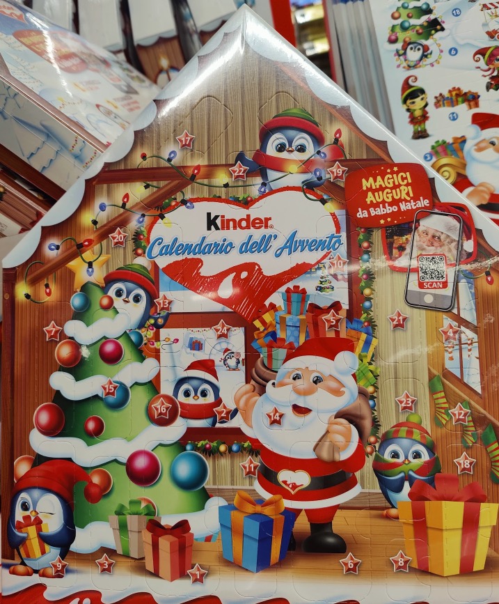 Questo calendario dal peso di 123 grammi contiene 24 pezzi: 5 Kinder cioccolato mini, 6 Kinder Mini Eggs nocciola, 9 Kinder Love mini e 4 Kinder Mini friends milk.