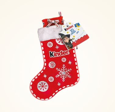 La calza della befana Kinder in velluto rosso contiene ben 10 pezzi: 4 Kinder maxi, 1 confezione Kinder cioccolato, 3 Kinder cereali e 2 Kinder Bueno.