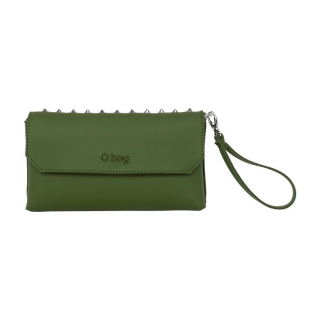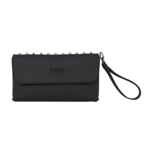 La nuova pochette O bag soft pretty è realizzata in tessuto gommato con borchie applicate sulla parte superiore, chiusura a zip ed è dotata del manichetto a bracciale.