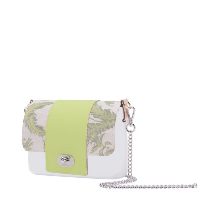 Pattina O Pocket in tessuto a fantasia foglie con fascia in ecopelle, dal prezzo di 34 euro.