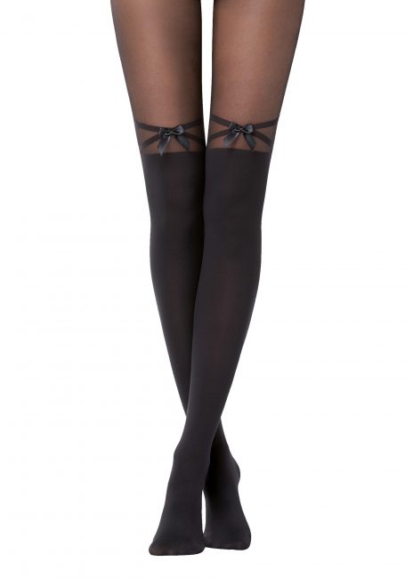Un altro modello di collant davvero femminile ed intrigante è la calza 70 denari effetto longuette con il piccolo gioco d’incroci sopra il ginocchio e il fiocchetto.