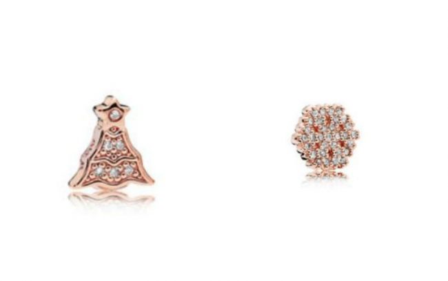 Elementi Pandora Rose a forma di Albero di Natale e di Fiocco di neve.