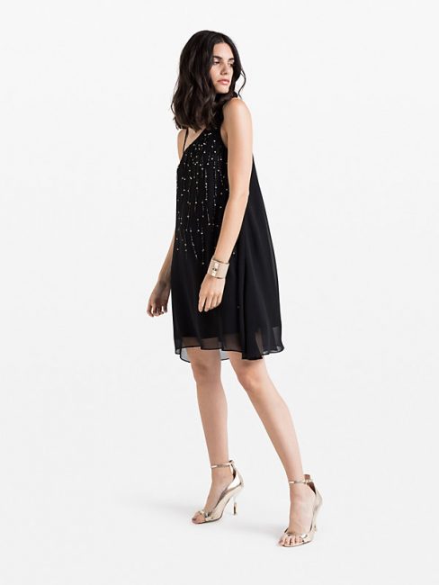 Un altro vestito da sera è il modello nero monospalla dalla linea morbida, decorato da perle bianche e strass, dal costo di 258 euro.