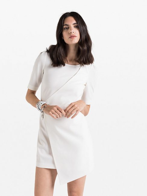 Vestito a portafoglio con maniche al gomito e gonna asimmetrica, dal costo di 228 euro.