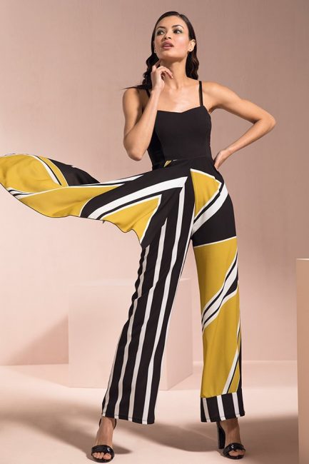 Jumpsuit con pantaloni palazzo in fluida georgette stampata e ricercato layer asimmetrico, dal prezzo di 149 euro.