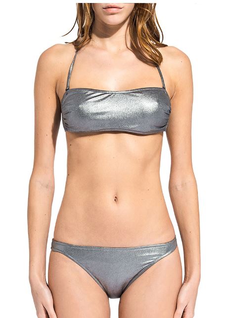 Bikini modello Suele in lycra laminata color argento con reggiseno a fascia imbottita e slip classici.