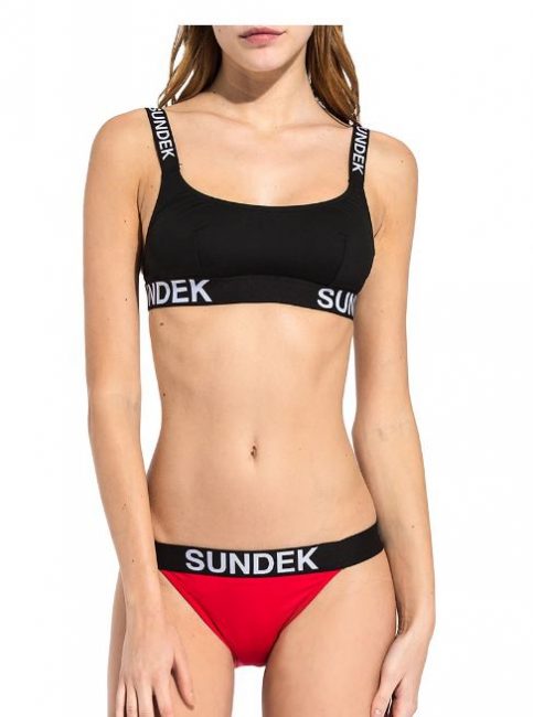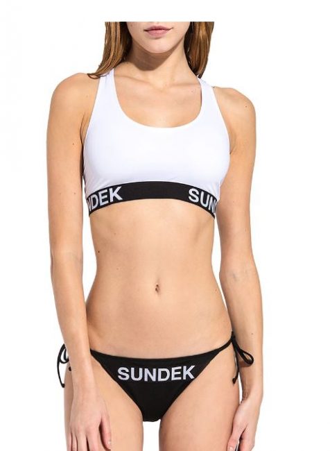 Un’altra versione è il modello composto dal top con spalline larghe elastiche con la scritta Sundek abbinato a slip sgambato.
