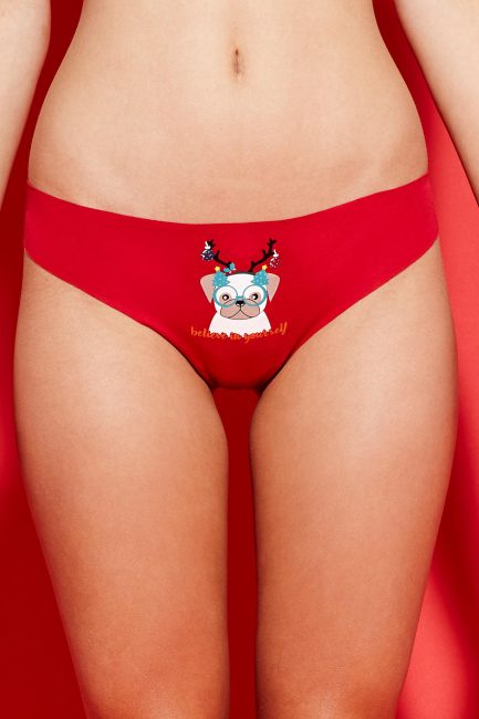 Simpatiche ed accattivanti slip brasiliane con stampe natalizie frontali e pizzo rosso sul retro, dal costo di 5,90 euro.