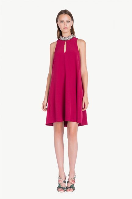 Abito corto da cerimonia Twin-Set Simona Barbieri, dalla linea ad A con collo gioiello e apertura a goccia frontale.
