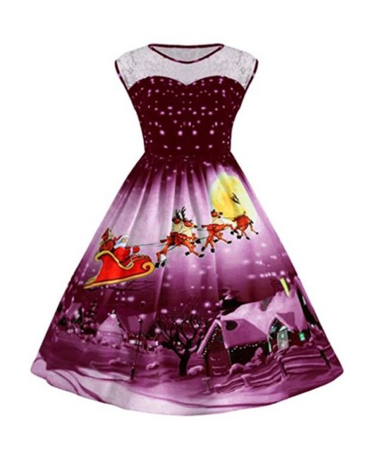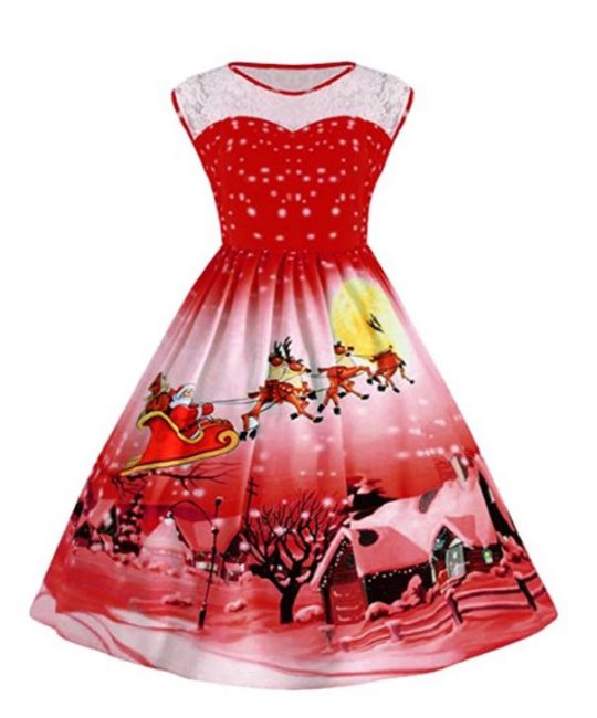 L’abito è un modello skater dress con la gonna ampia stile vintage, il bustino è smanicato con lo scollo tondo con dettagli in pizzo ed è realizzato in poliestere con stampe prettamente natalizie.