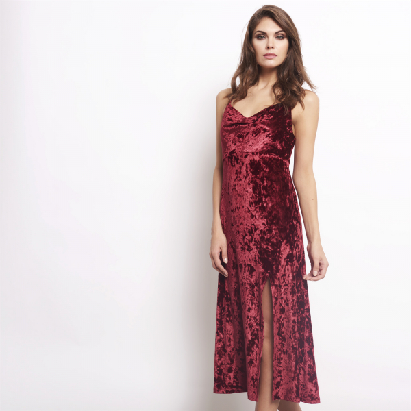 Vestito longuette in ciniglia color rosso bordeaux con le spalline fine incrociate sulla schiena.