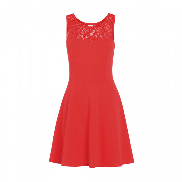 Vestito smanicato in jersey dalla linea svasata con la parte superiore in pizzo, dal prezzo di 29,99 euro.