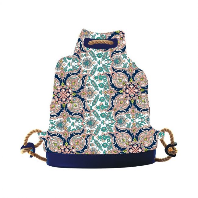 O bag soft in tessuto fantasia Riviera nei colori: rosso, blu e giallo.